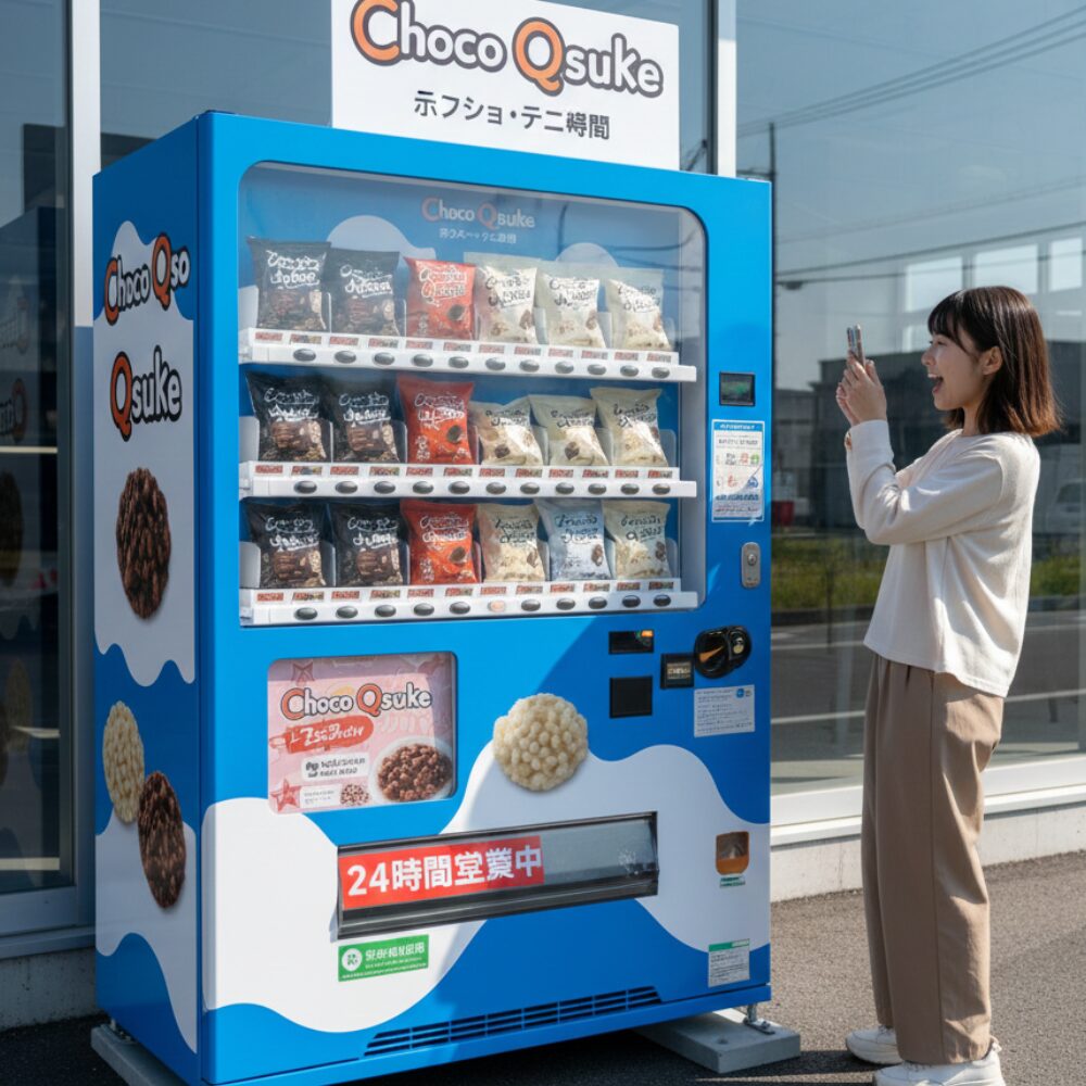 個人的に一番ワクワクするのが、製造工場の前に設置されている「チョコQ助専用自動販売機」の存在です。