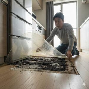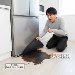 数年後に引越しで冷蔵庫を動かしたとき、マットの下が真っ黒なカビでびっしり…なんてことになったら、床材(フローリングやクッションフロア)は腐食し、修復不可能なダメージを受けてしまいます。これは掃除で落ちるレベルではなく、床の張り替えが必要になる深刻な事態です。