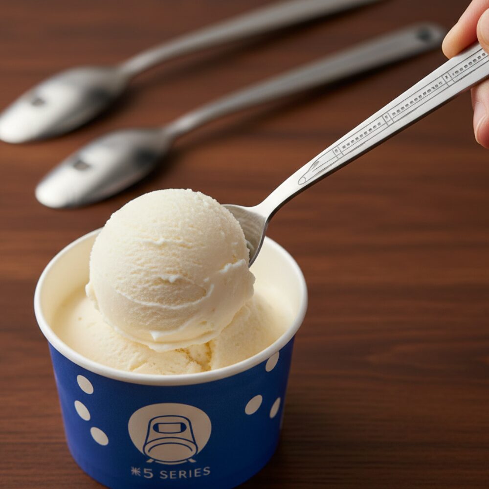 あの硬さを攻略するための必須アイテム、「アルミアイススプーン」も通販で購入可能です。N700SやE5系などの車両デザインが施されたスプーンは、熱伝導率が高く、体温を伝えてアイスをじんわり溶かしてくれます。