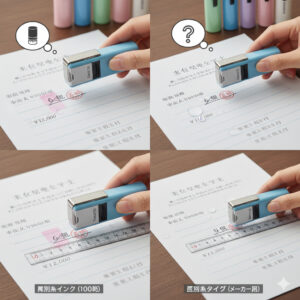 多くの100均印鑑は「染料系インク」を使用しています。これは水に滲みやすく、光に当たると色が薄くなりやすい性質があります。一方で、メーカー品(シヤチハタ社製など)は「顔料系インク」や「油性インク」を使っていて、こちらは耐久性が高く、長期間保存しても印影が消えにくいんです。
