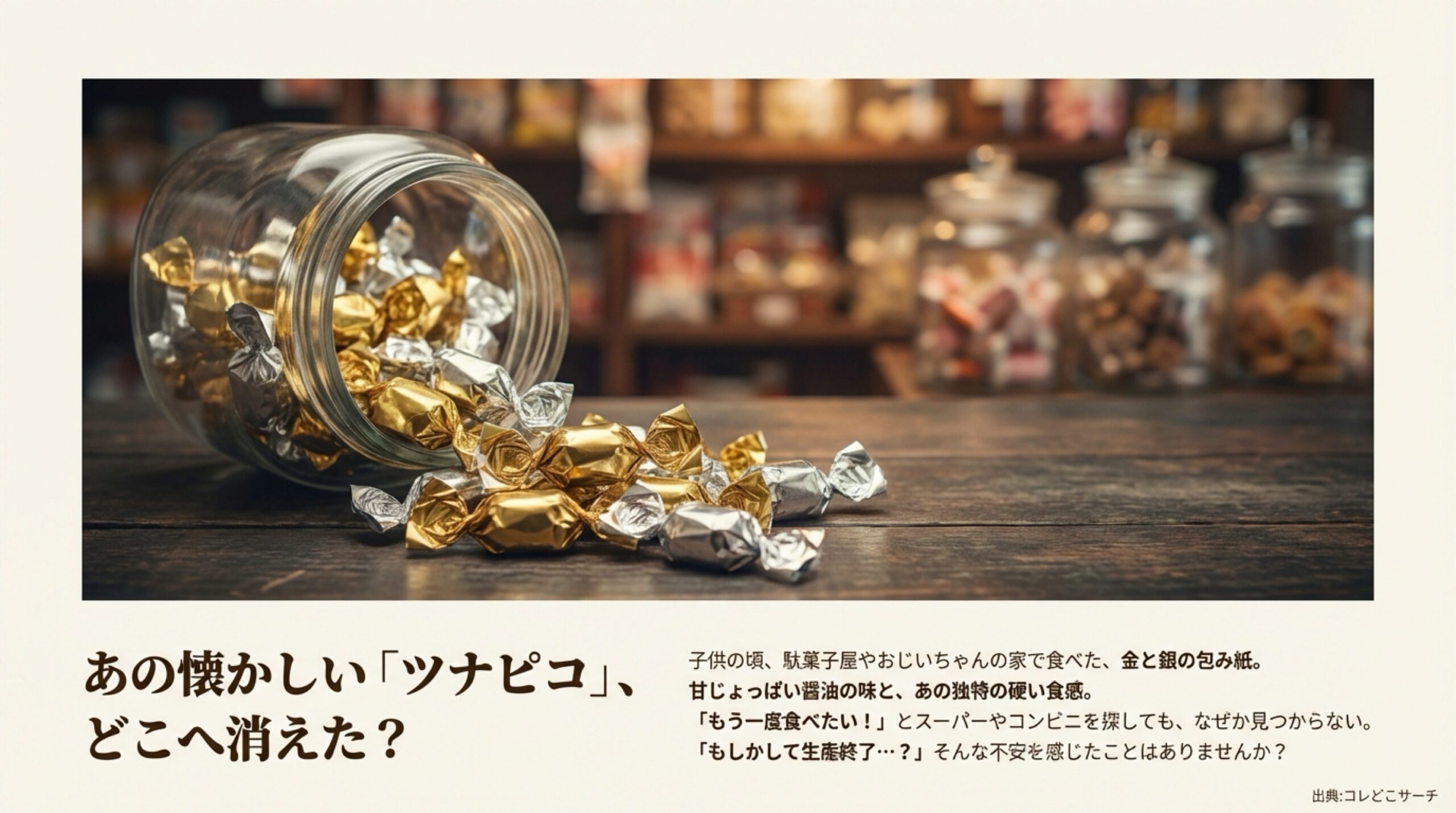 子供の頃、おじいちゃんの家や近所の駄菓子屋さんで食べた、あのキラキラと輝く金と銀の包み紙。「ツナピコ」という名前を聞いただけで、口の中に広がる甘じょっぱい醤油の味と、独特の硬めの食感を思い出して、無性に食べたくなるときがありませんか?