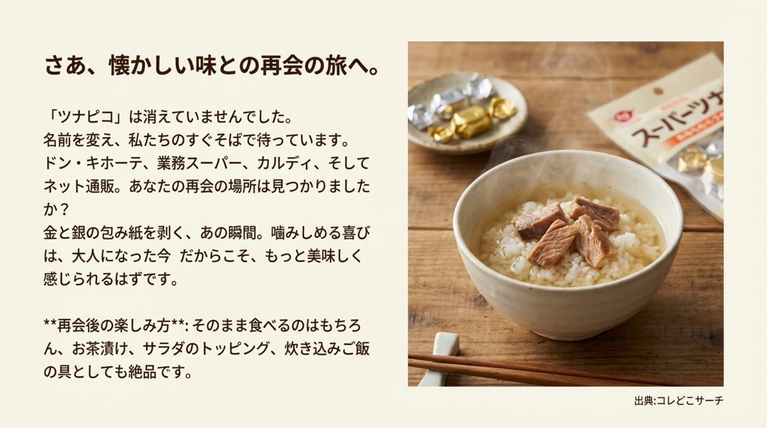しかし、その製法や味はOEM供給などを通じて「スーパーツナ」等の名称でしっかりと受け継がれています。「ツナピコという名前の商品」は見かけなくなったかもしれませんが、「ツナピコの魂(味と形)」を持った商品は、今も私たちのそばに存在しているのです。