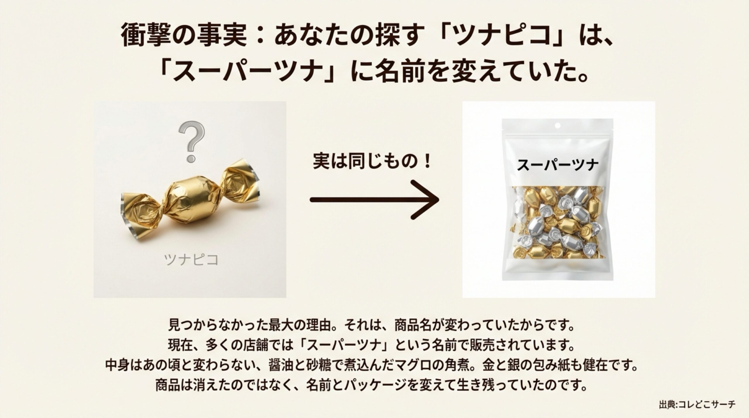 まず最初に、探している商品が見つからない最大の理由をお伝えしなければなりません。実は、私たちが探している「ツナピコ」という商品は、現在のお店の棚では「スーパーツナ」という名前で売られていることがほとんどなのです。