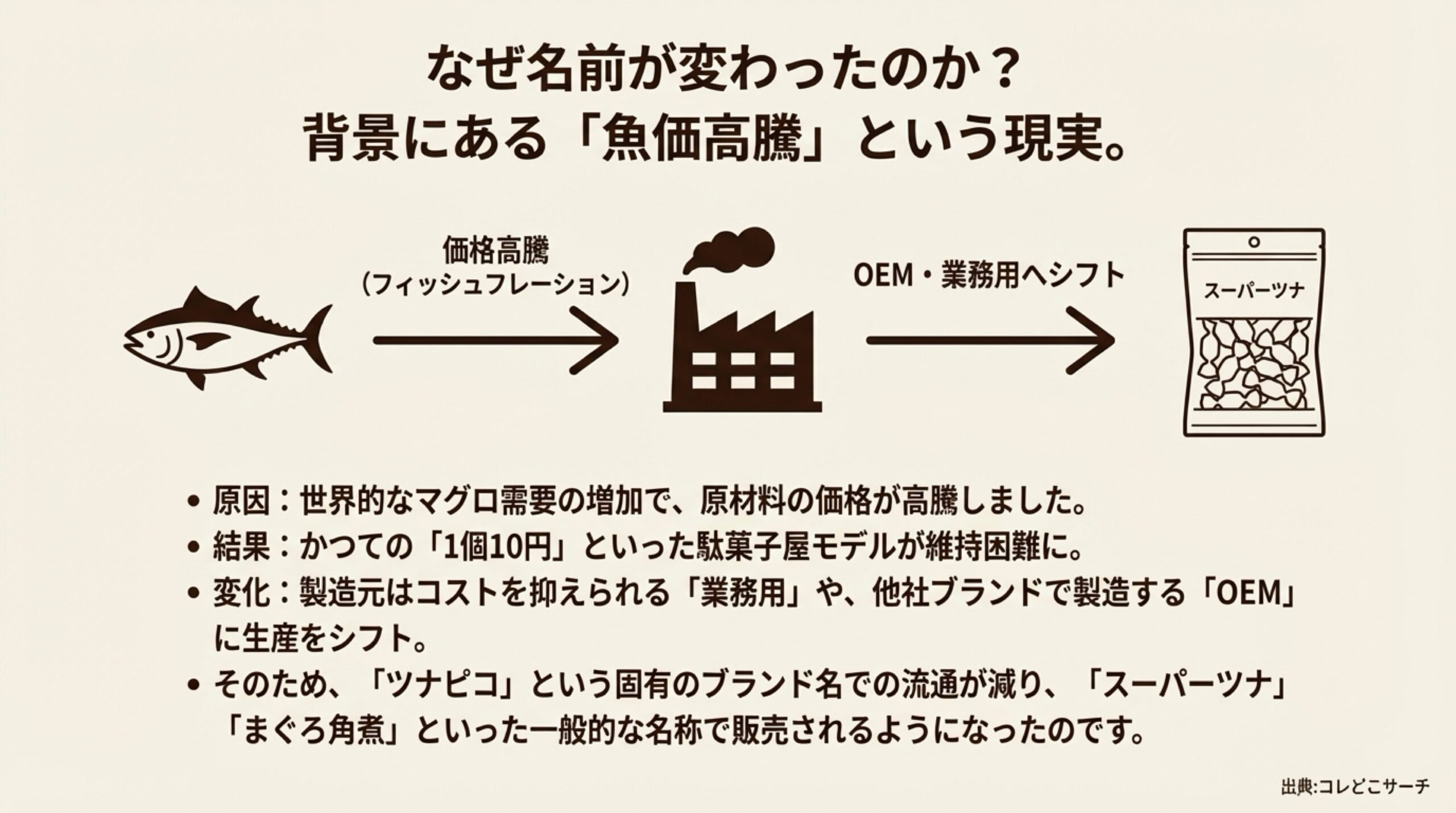 かつては静岡県焼津市の石原水産などが「ツナピコ」という商品名で製造し、全国の駄菓子屋やスーパーに卸していました。しかし、ここ数十年で世界的なマグロ需要の増加に伴い、原材料となるマグロの価格が高騰(フィッシュフレーション)しました。これにより、1個10円でバラ売りするというかつてのビジネスモデルが維持できなくなったのです。
