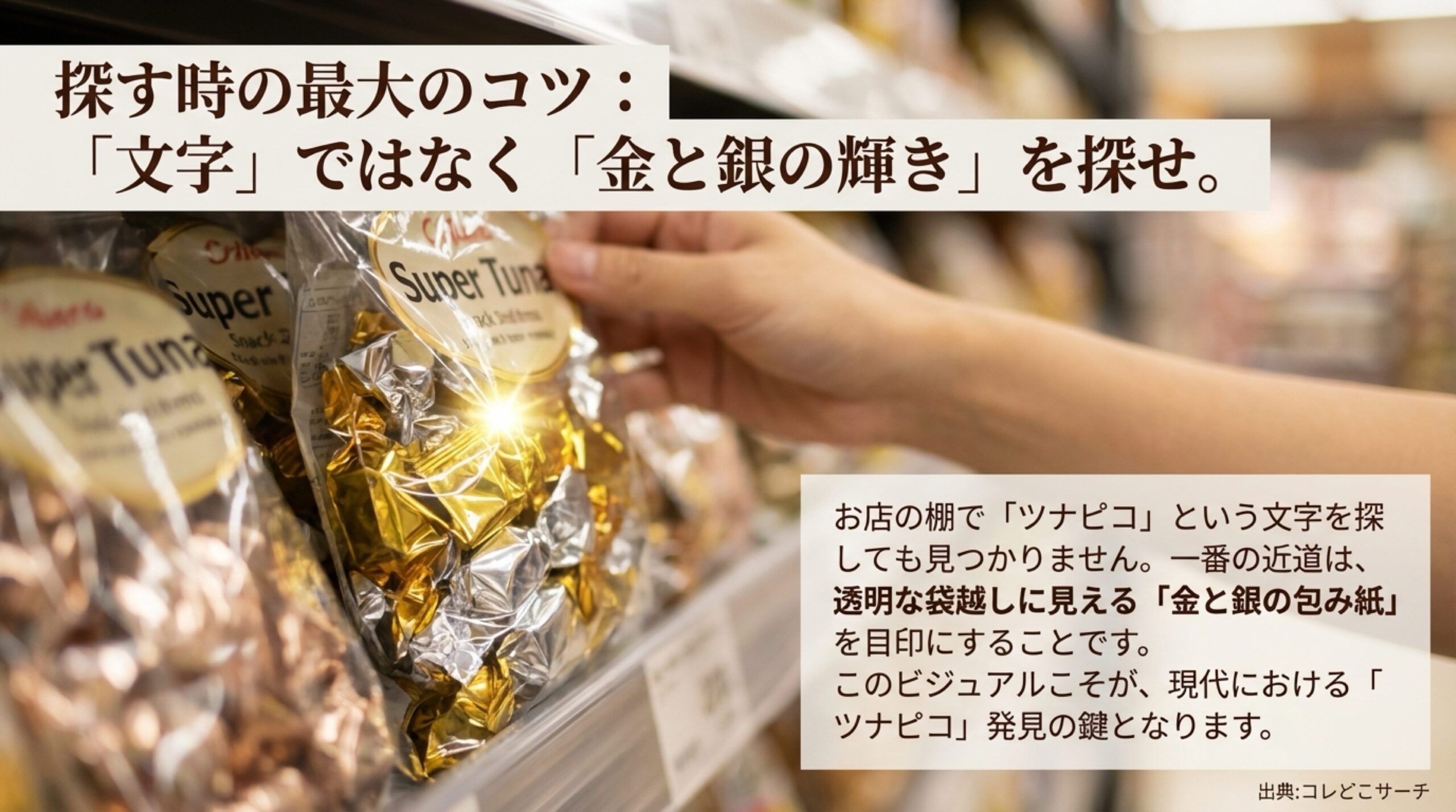 売り場の棚を見るときは「ツナピコ」という文字を探すのではなく、透明な袋越しに見える「金と銀の包み紙」を探してください。それが現代のツナピコ、すなわち「スーパーツナ」です。