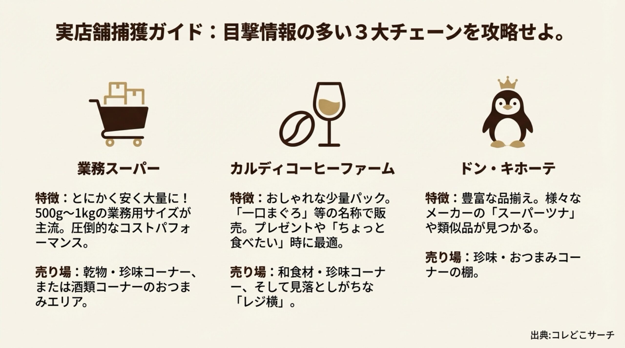 - ドン・キホーテや業務スーパーなど、実店舗での具体的な目撃情報と売り場攻略法