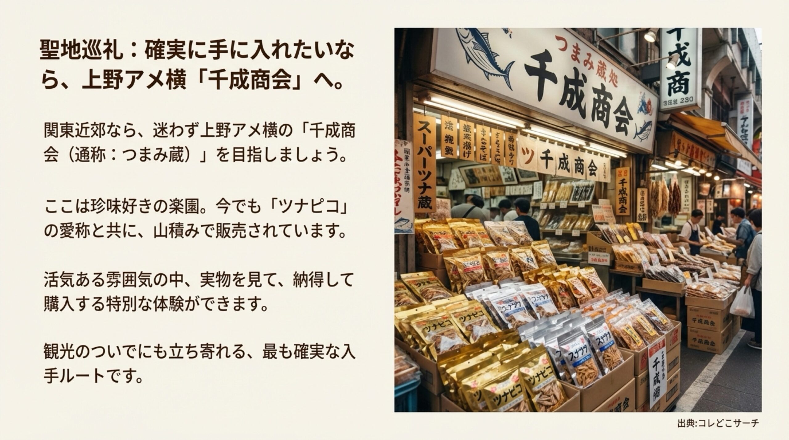 JR御徒町駅から徒歩数分、アメ横の賑わいの中にある「千成商会(通称:つまみ蔵)」は、珍味好きにとってのパラダイスです。ここでは現在でも明確に「ツナピコ」という愛称とともに商品が販売されており、店頭には山のように積まれたツナピコの袋が鎮座しています。