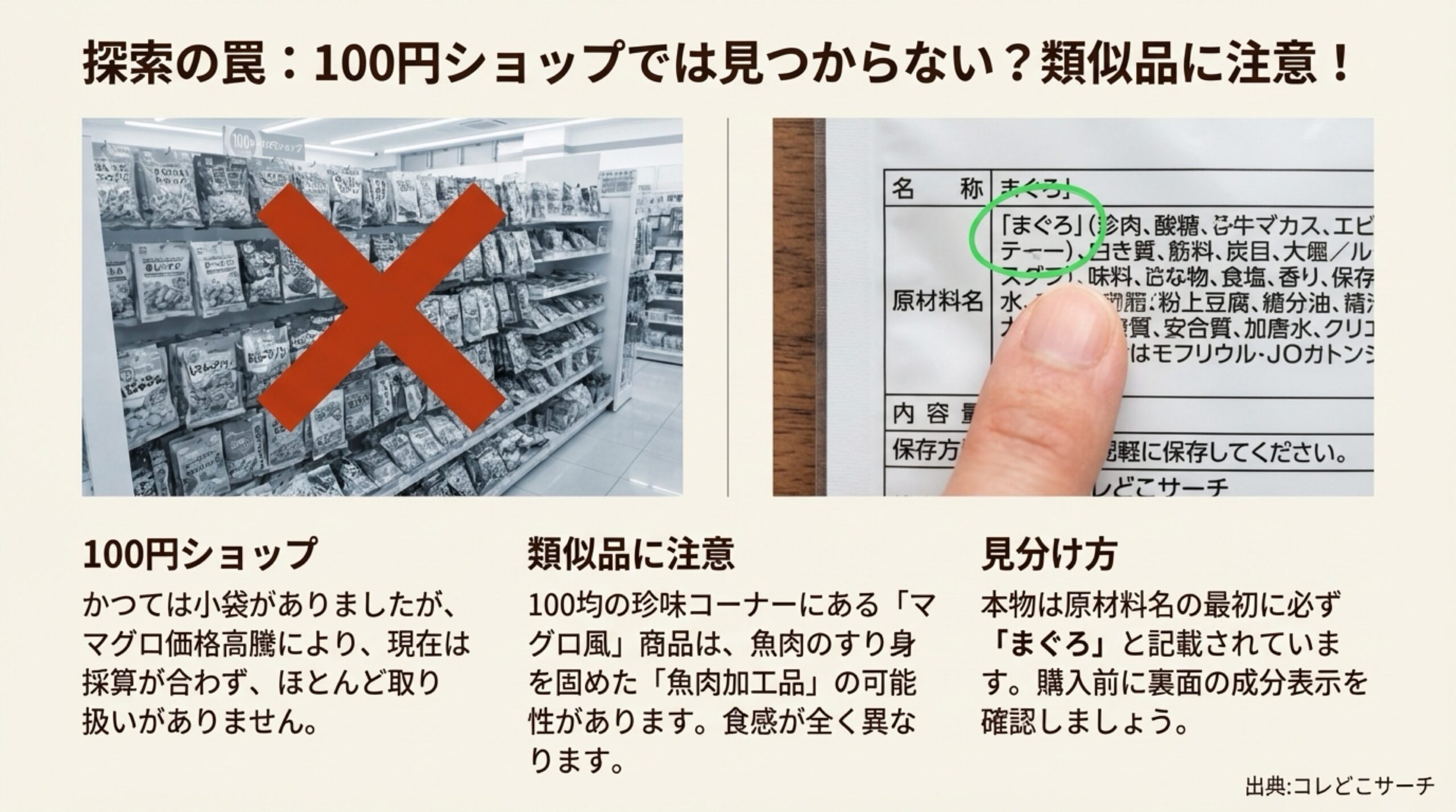 100均の珍味コーナーで「マグロ風」の商品を見かけることがありますが、購入の際は裏面の成分表示をよく確認してください。中には、マグロの正肉ではなく、魚肉のすり身を固めたソーセージに近い食感の加工品や、マグロの使用率が低い代替品であるケースがあります。