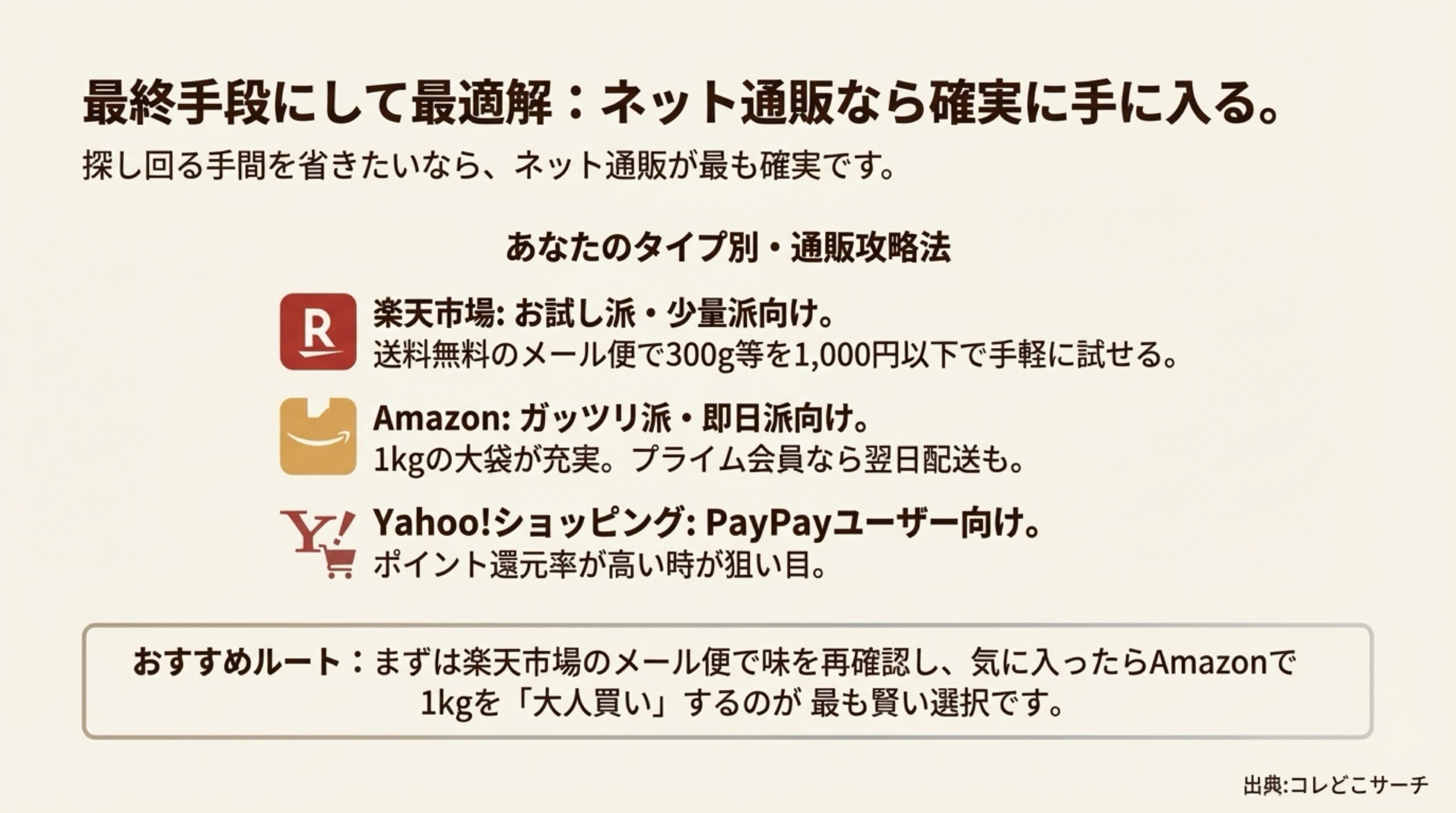 個人的な推奨ルートとしては、「まずは味を思い出したい」なら楽天市場のメール便対応商品をポチるのが心理的ハードルが低くておすすめです。ポストに投函されるので受け取りの手間もありません。そして、「やっぱりこれだ!」と確信したら、Amazonや楽天で「業務用1kg」を大人買いするのが、グラム単価(コスパ)を極限まで下げる最適解です。
