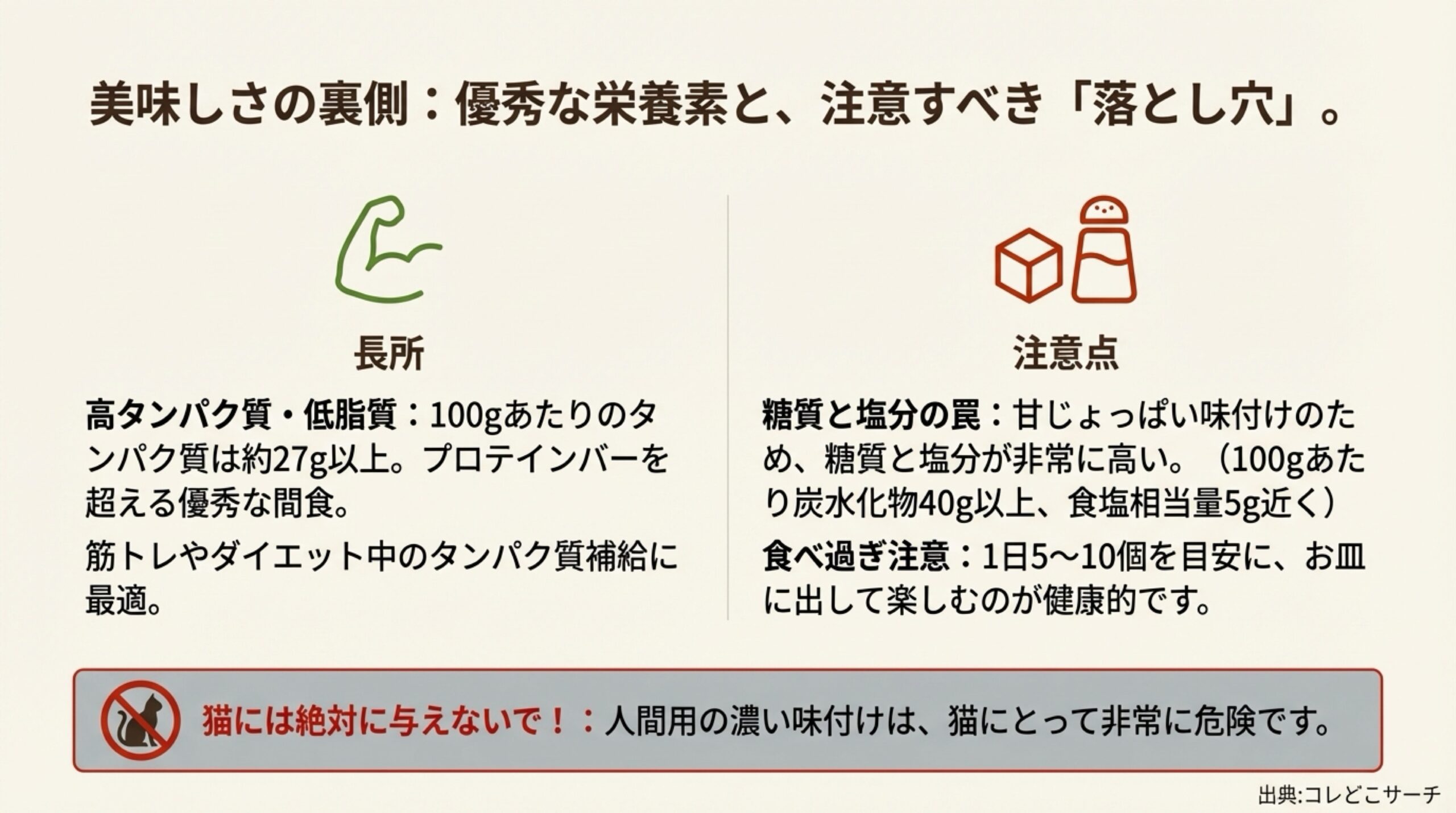 しかし、手放しで喜んではいけません。あの「甘じょっぱい味」を思い出してください。そう、製造過程で大量の「砂糖」と「醤油」が使われています。そのため、炭水化物(糖質)と食塩相当量はかなり高めの数値になっています。